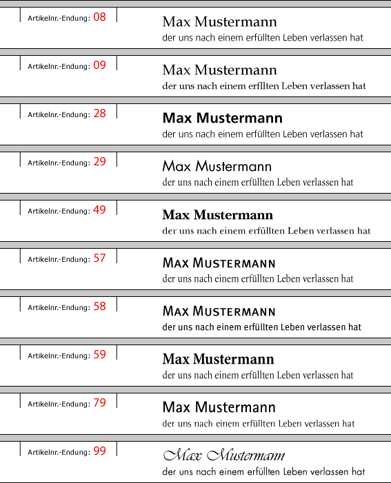 So ist auch die Auswahl der Schriftart durch die Artikelnummer bestimmbar. Die beiden letzten Zahlen der Artikelnummer stehen codiert für eine